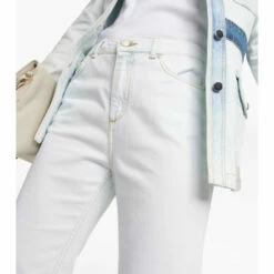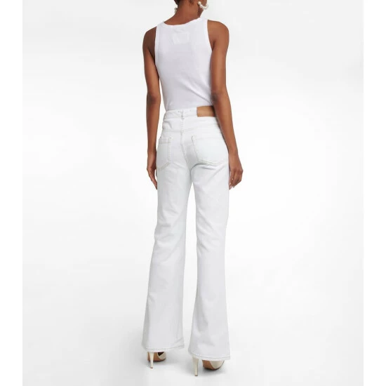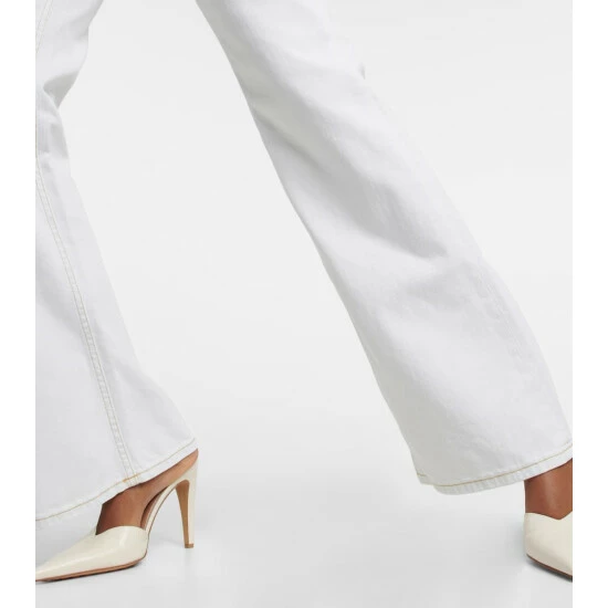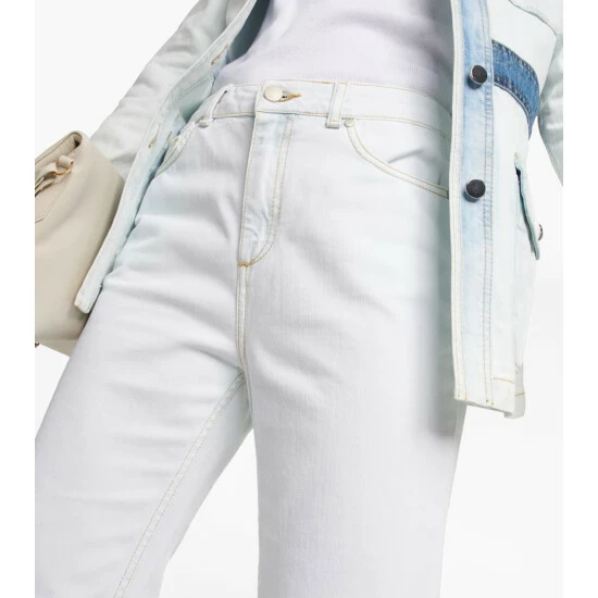 The Denim Love jeans from Dorothee Schumacher have a high-rise waistband and flared hems. This ’70s-tinged design is made from bleached denim and accented with contrast topstitching.