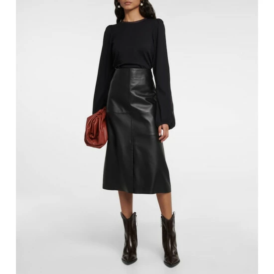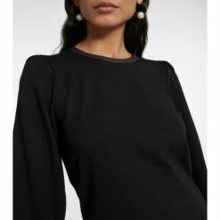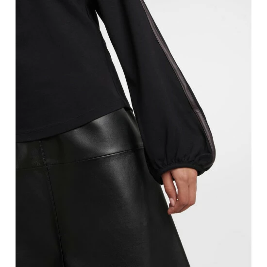 This top from Dorothee Schumacher has a fitted silhouette with a high neckline and dramatic bishop sleeves. Here in black, it’s finished with a faux leather rimmed collar.