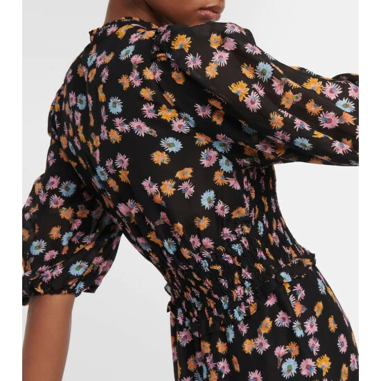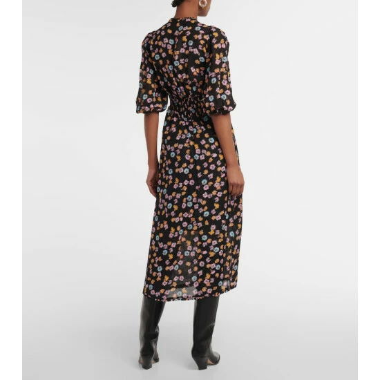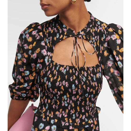 This joyful midi dress by Dorothee Schumacher balances a blooming floral print with a cape-inspired cutout neckline. This artful piece has a smocked waist, puffed mid-length sleeves, and a draped length.