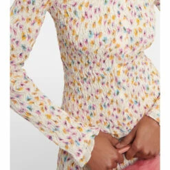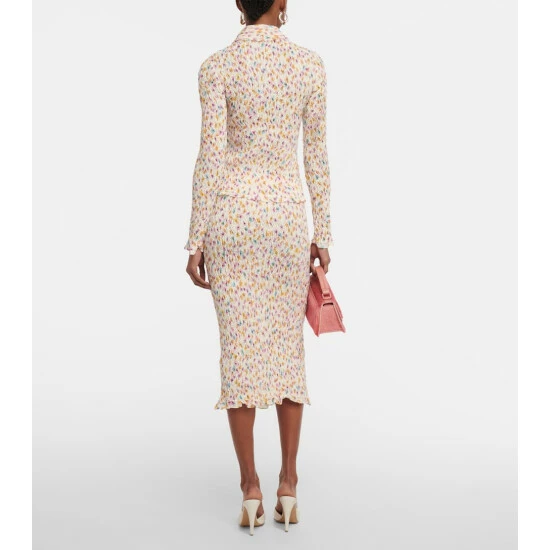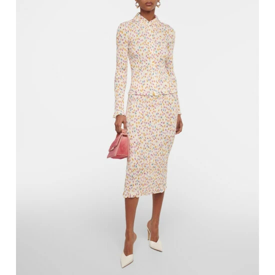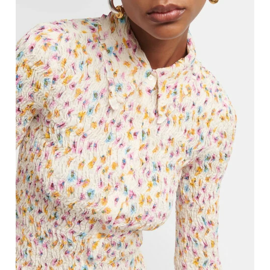 This joyful top by Dorothee Schumacher balances a blooming floral print with a plissé texture. This piece is shaped with a point collar, open front placket, and delicate lettuce trims.