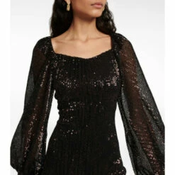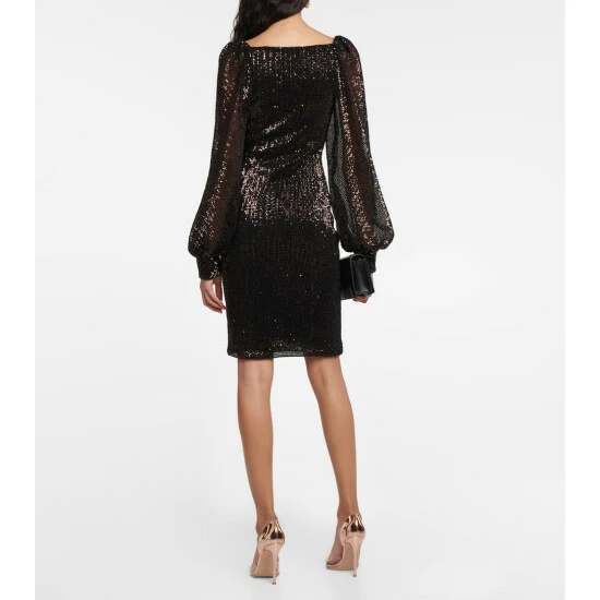 The Sparkling Moment minidress from Dorothee Schumacher features all-over sequin embellishment and a square neckline. It is accented by bias-cut, puffed blouse sleeves that are gathered at the shoulders.