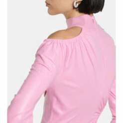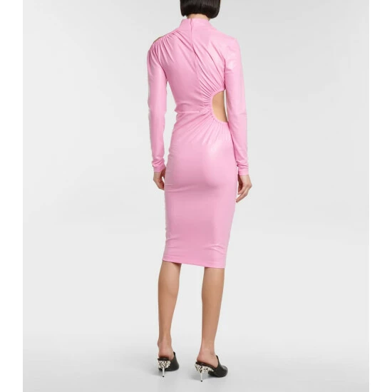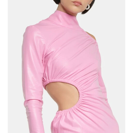 The Alice dress from Rotate Birger Christensen features subtly placed cutout details at the waist and shoulder. Made from shiny, stretchy jersey, it has a fitted silhouette and a mockneck collar.