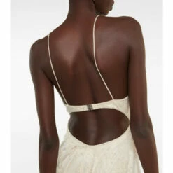 Made an entrance with a chapel train wearing this wearing the Miley gown from Rotate Birger Christensen. It has a deep V-neck with thin shoulder straps, and it features a round cutout at the back.
