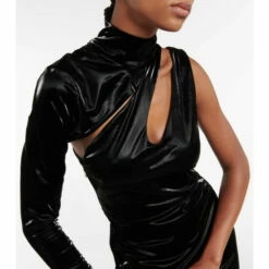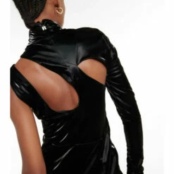 Crafted from a coated vinyl that resembles leather, this dress from Rotate Birger Christensen brings a tough-luxe edge to after-dark events. A high neck juxtaposes a mini-length, while skin-exposing cutouts accent the bodice.