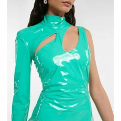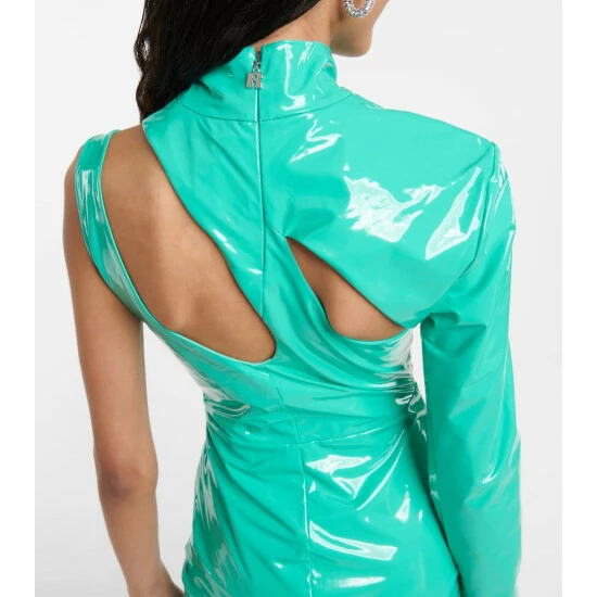 Made from shiny vinyl, this minidress from Rotate Birger Christensen is a one-sleeved design with a turtleneck and slits at the chest.