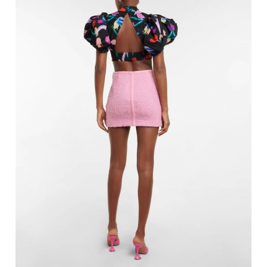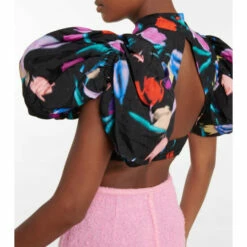 The Dusk crop top from Rotate Birger Christensen is made from jacquard. Featuring an abstract floral motif, it has a mockneck collar, voluminous puff sleeves, and a cutout back.
