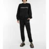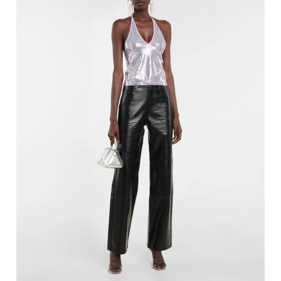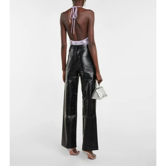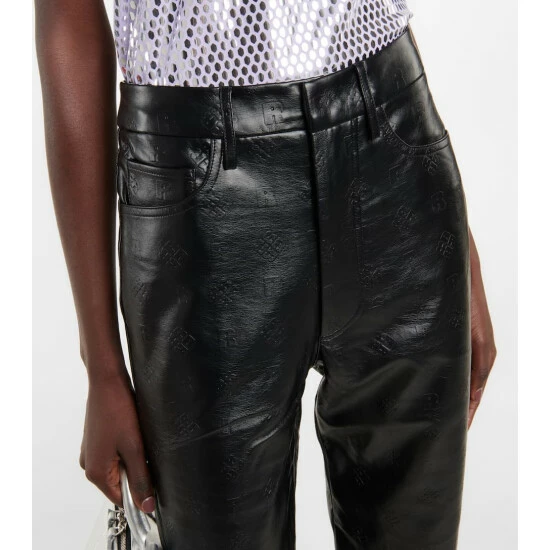 The Rotie pants from Rotate Birger Christensen are a faux leather design with raised logo embossing. A signature silhouette, they have a high-rise waist and wide, long legs.