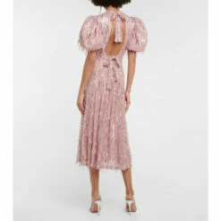 This midi dress from Rotate Birger Christensen is sure to add sparkle to any occasion. Adorned with shimmering sequins that create an all-over fringe effect, it features a fitted waistline, a mockneck, and billowing puff sleeves.