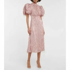 This midi dress from Rotate Birger Christensen is sure to add sparkle to any occasion. Adorned with shimmering sequins that create an all-over fringe effect, it features a fitted waistline, a mockneck, and billowing puff sleeves.